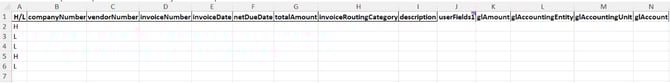 - For the H rows, information such as the Company, Vendor, Invoice Number, Invoice Amount, Invoice Date, etc should be completed.