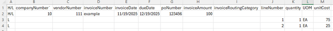 - For the H rows, information such as the Company, Vendor, Invoice Number, Invoice Amount, Invoice Date, PO Number, etc should be completed.