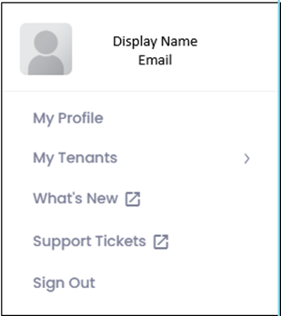 Clicking on your Avatar brings up your display name, email address and options for you to select from: My Profile, My Tenants, What's New, Support Tickets, and Sign Out