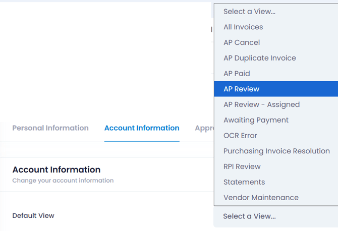 • From the Account Information pane, you have the ability to set a default view (per tenant),