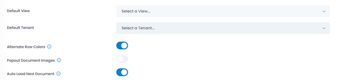 • default tenant (takes place upon each sign on), allow alternating row colors,  default the image pop out window (can do manually from record if preferred), and auto load next document on route.