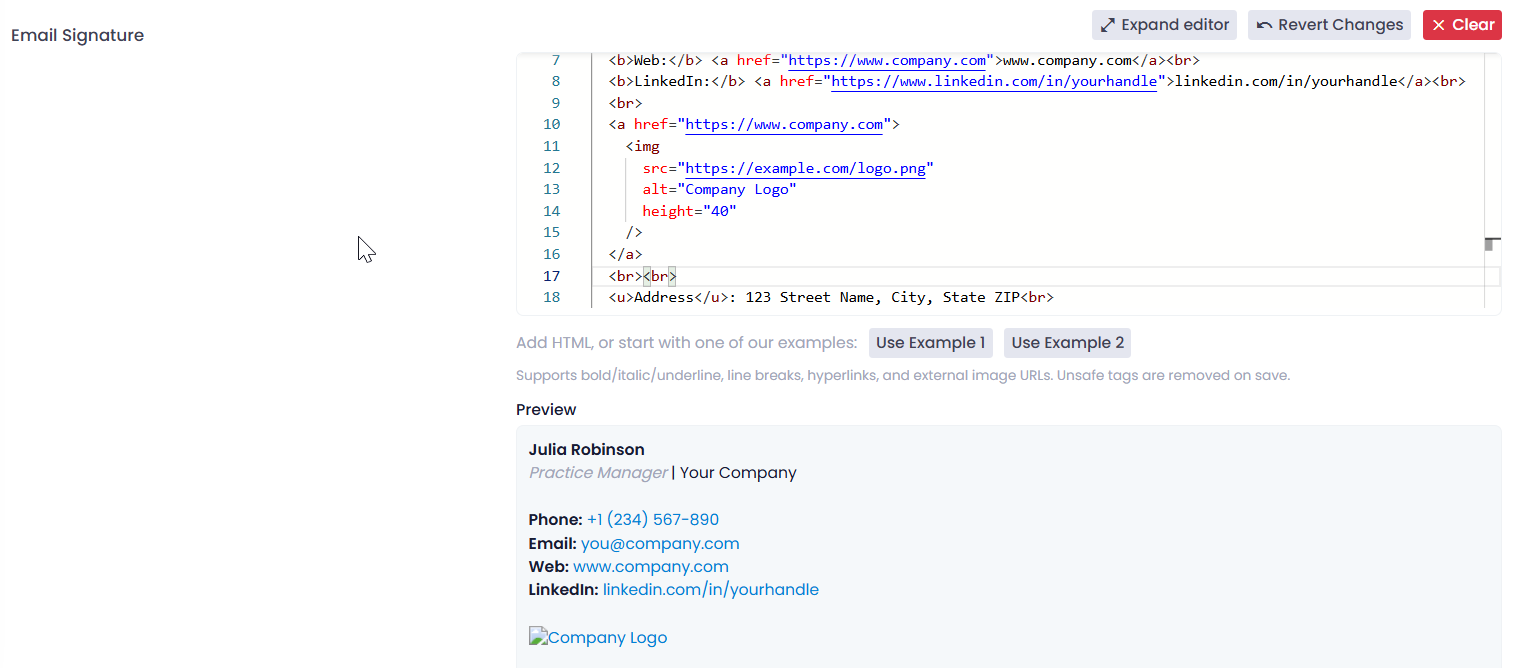 • Choose from the templates provided (Example 1 or Example 2) and populate your personal/business information in the template. You can preview the appearance of your signature in the Preview box below: