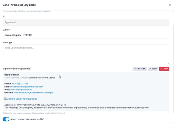 Users can define their signature directly in User Preferences, including formatted text, links, and branded contact information. When sending an email from Yoga, the signature is automatically added to the bottom of the message. Users can still edit or remove the signature before sending if needed.