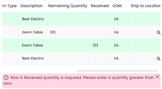 Receiving lines must now include a valid received quantity before they can be paired and sent to the ERP. Quantities must be numeric and greater than zero, with support for decimal values for partial receipts. If a line cannot be paired, an inline message explains why, while allowing users to continue working with other valid lines.