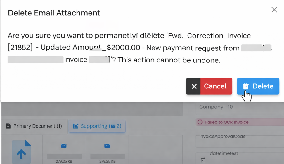 Additionally, when a document posts to IDM, any attached .eml or .msg supporting documents will be included and sent in their original format as attachments on the primary document record. If posting fails, the document will return to AP Review, where users can retry posting or remove the attachment before reposting.