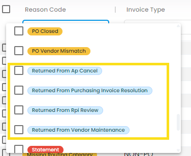 Users can now filter and sort by “Returned From” reason codes (for example, Returned From Purchasing Invoice Resolution or Returned From Vendor Maintenance) directly within document views. Previously, these values appeared in the Last Reason Code column but were not available as filter options.