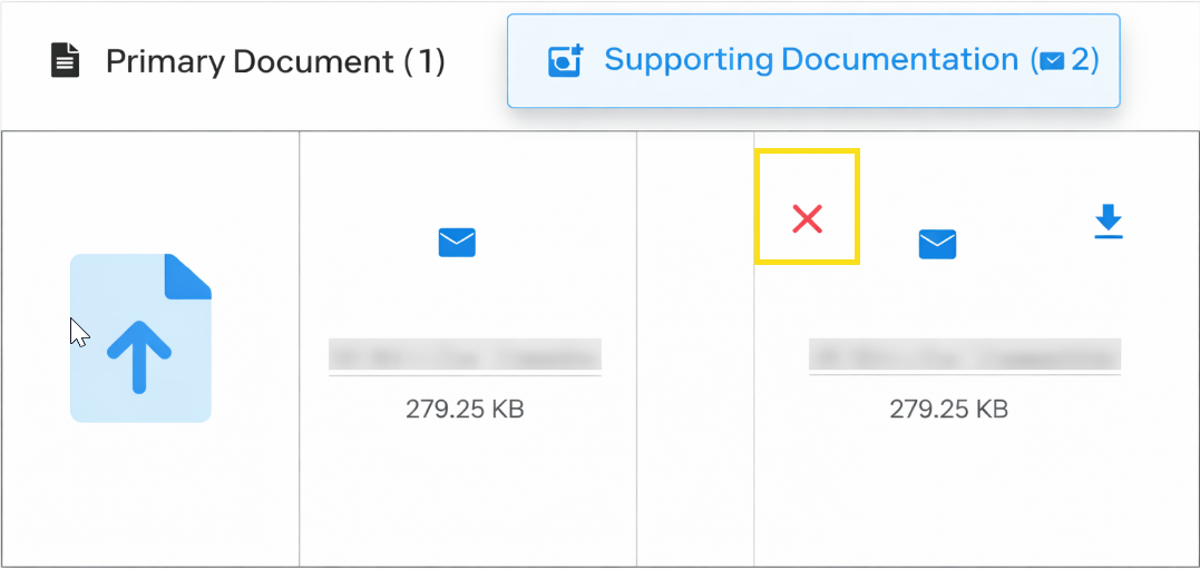 Users can now remove incorrectly uploaded .eml or .msg email files from Supporting Documentation. A Remove (X) icon allows users with upload permissions to permanently delete these attachments if they were added in error. Removal can be performed from any queue or document state, and all removals are recorded in the audit trail.